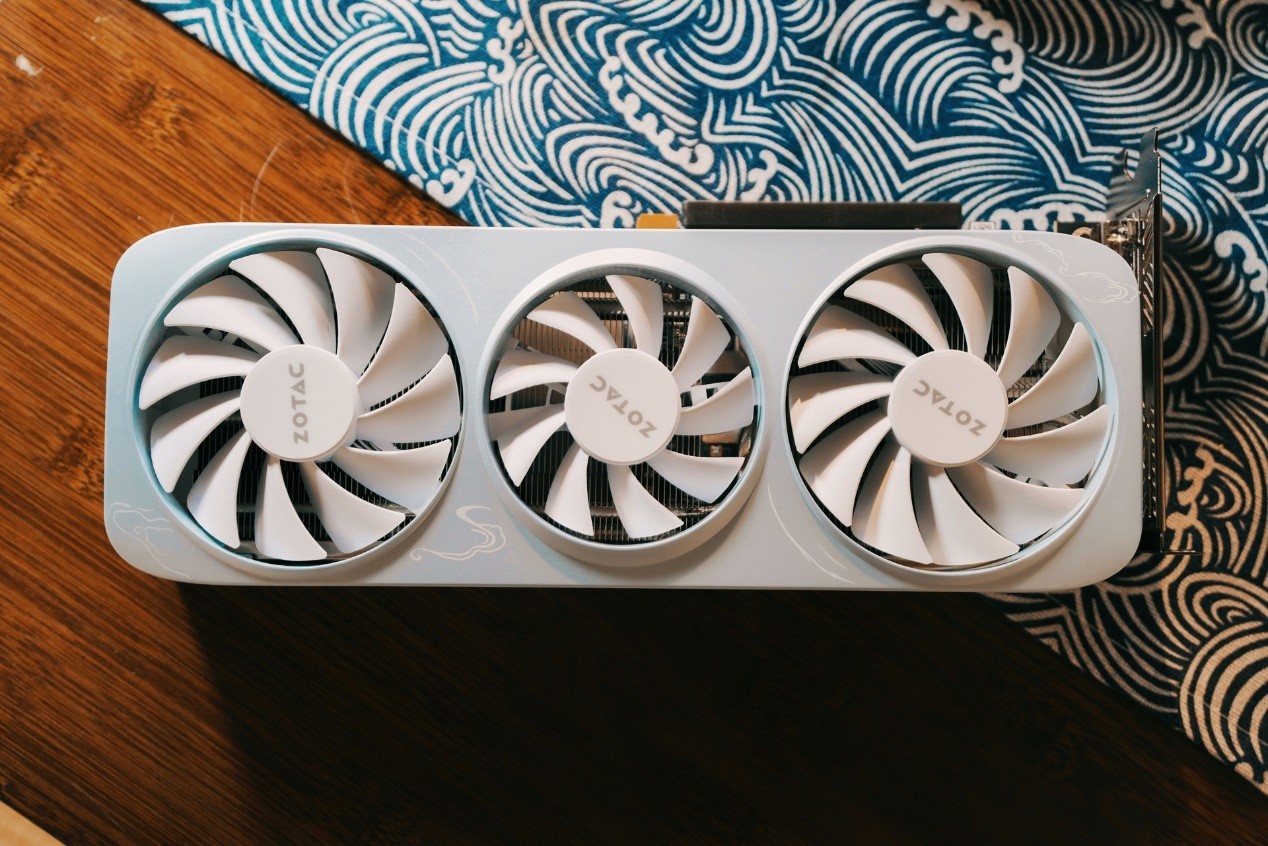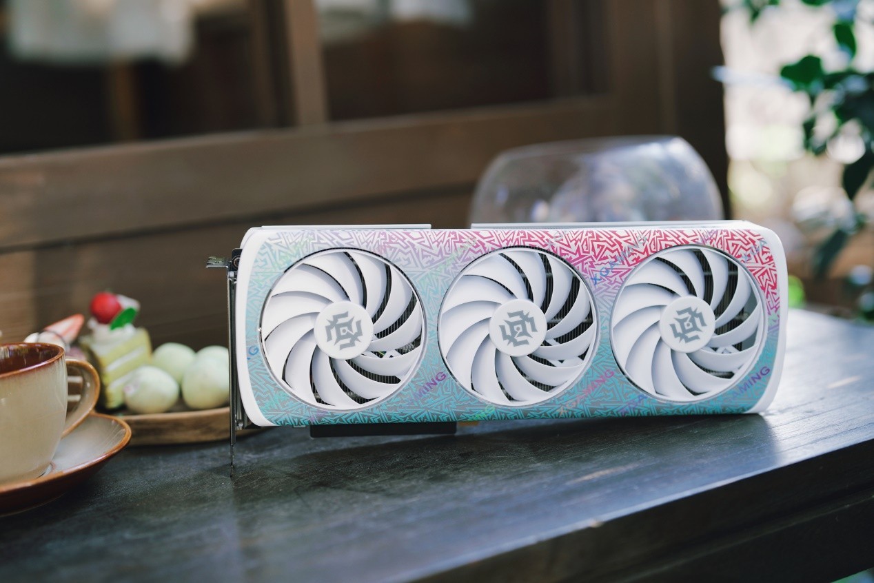 设计灵感源自中国水墨意象,卡身大面积留白,笔墨走势如行云流水,意境天成。搭载冰镜铜底导热模组,导流罩采用二大一小风扇设计,支持PWM智能调速;背板采用穿透式设计,增强散热效率。配备16GBGDDR7高速显存与128Bit带宽,性能充沛,适合中度3D建模、渲染、视频剪辑及AI创作。