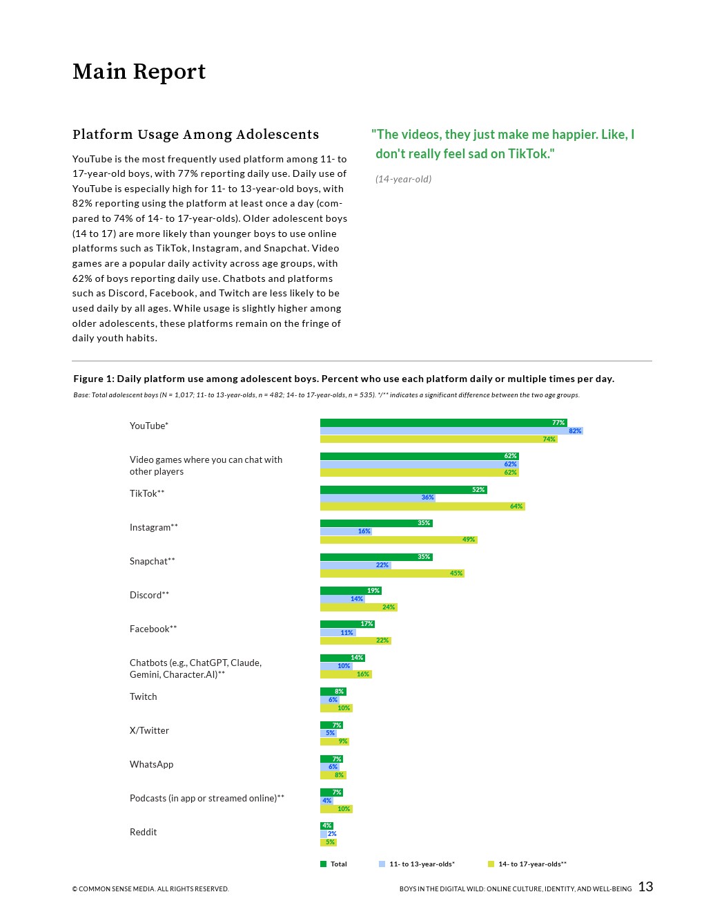 几乎所有11至17岁的男孩(94%)每日都会上网,其中YouTube以77%的每日使用率领先,其次是TikTok(52%)。超过半数(62%)的男孩每日玩带有聊天功能的电子游戏。