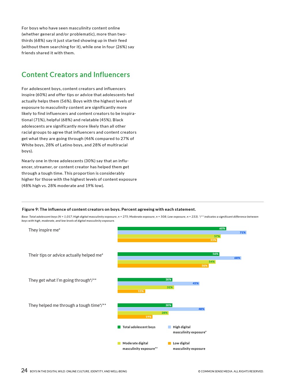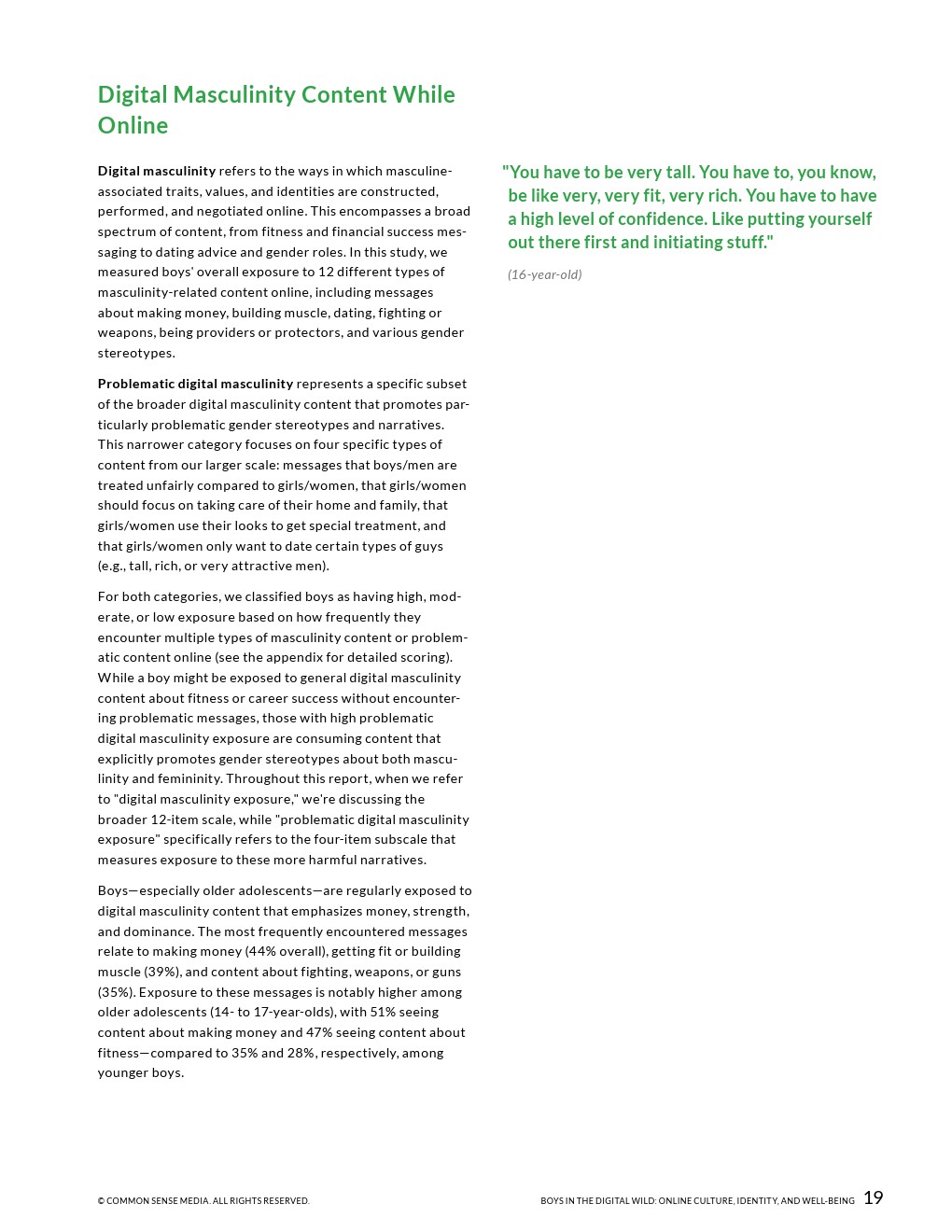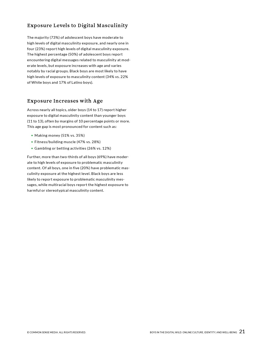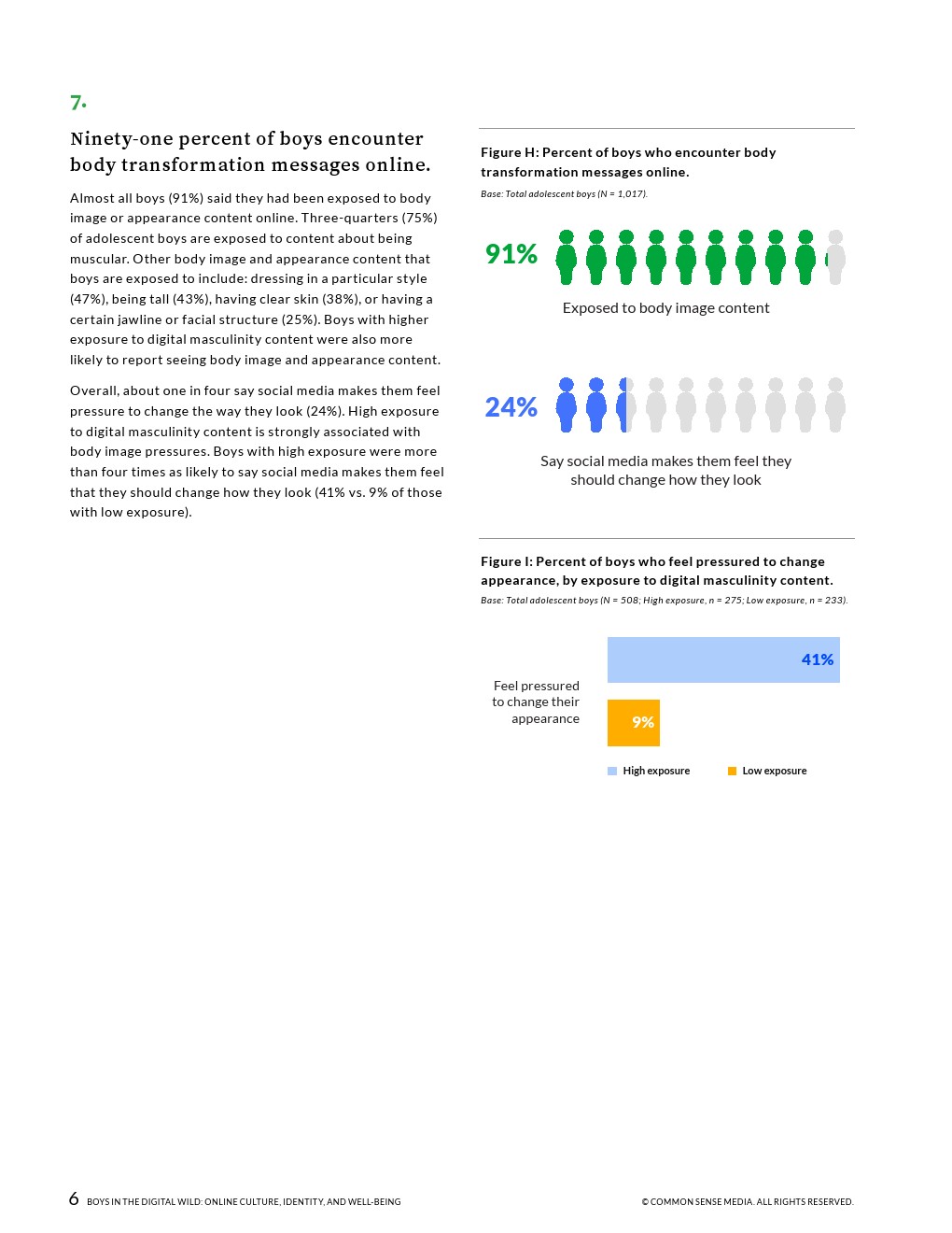 几乎所有男孩(91%)表示他们在网上接触过关于身体形象或外貌的内容。75%的青春期男孩接触到关于变得强壮的内容。男孩接触到的其他身体形象和外貌内容包括:特定的着装风格(47%)、身高(43%)、皮肤洁净(38%)、或拥有特定的下颌线或面部结构(25%)。