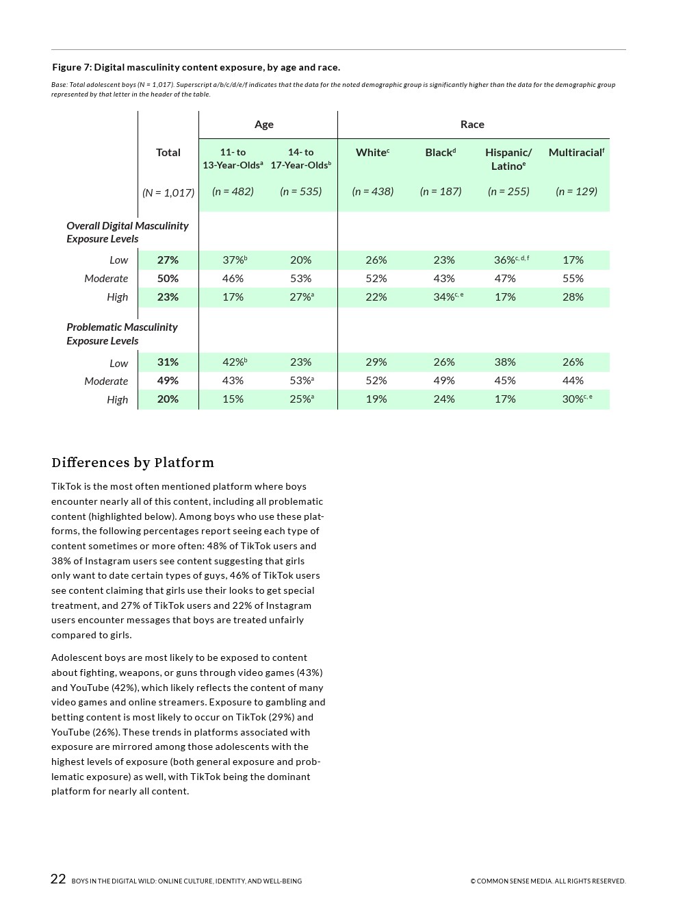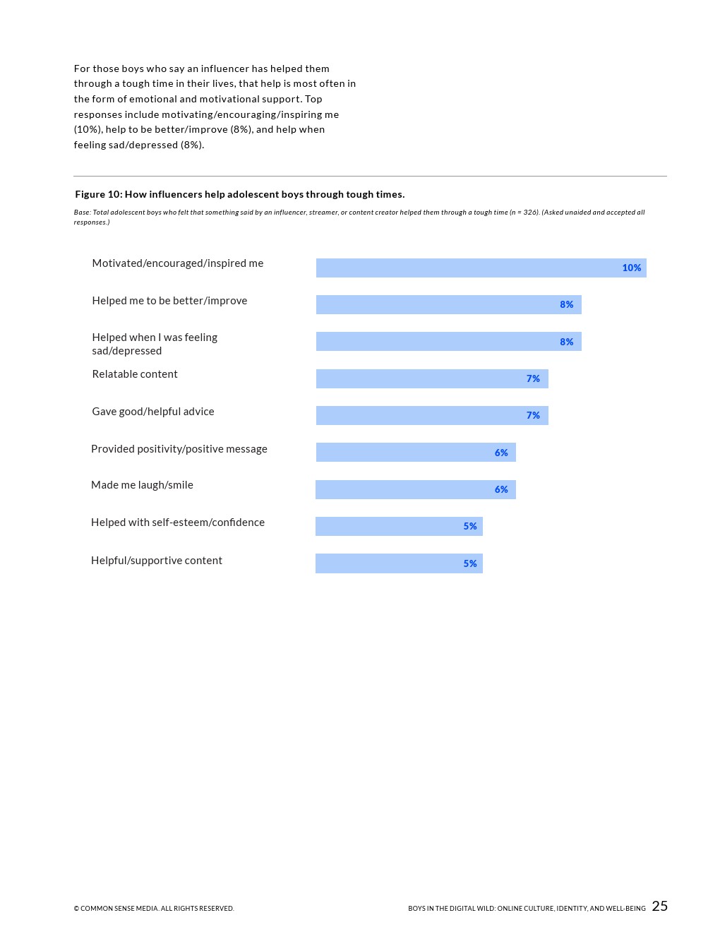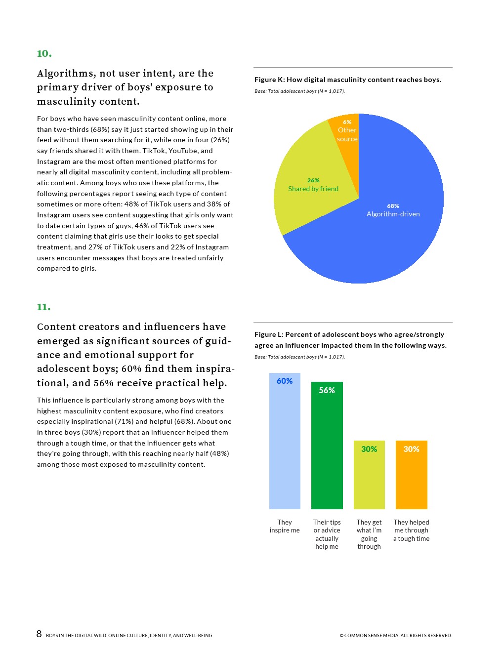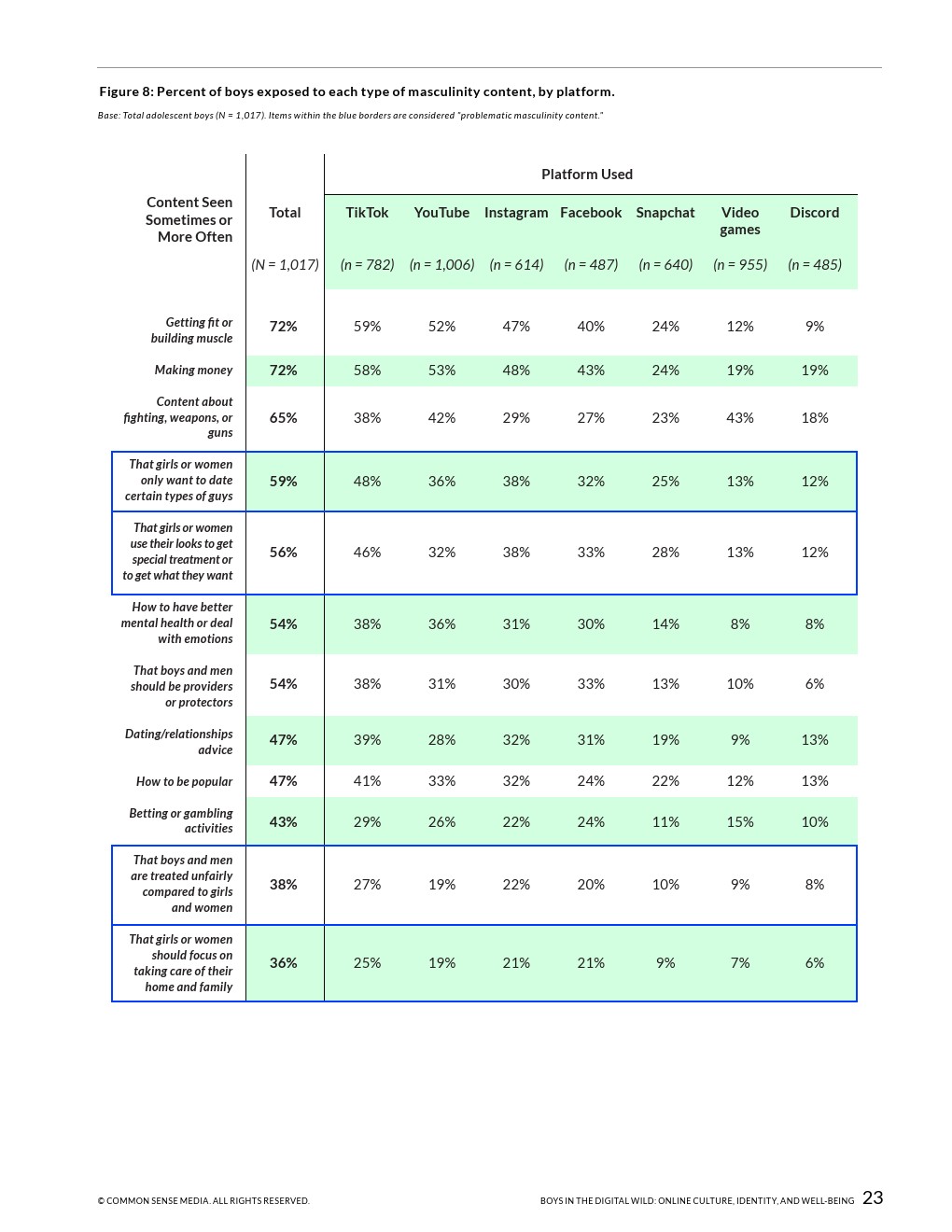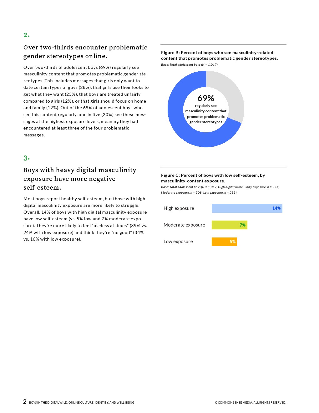 几乎所有男孩(91%)表示他们在网上接触过关于身体形象或外貌的内容。75%的青春期男孩接触到关于变得强壮的内容。男孩接触到的其他身体形象和外貌内容包括:特定的着装风格(47%)、身高(43%)、皮肤洁净(38%)、或拥有特定的下颌线或面部结构(25%)。