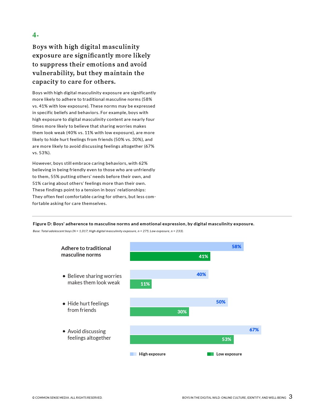 高度接触数字男性气质内容的男孩明显更倾向于遵循传统的男性气质规范(58% vs. 低度接触者的41%)。这些规范可能体现在特定的信念和行为中。