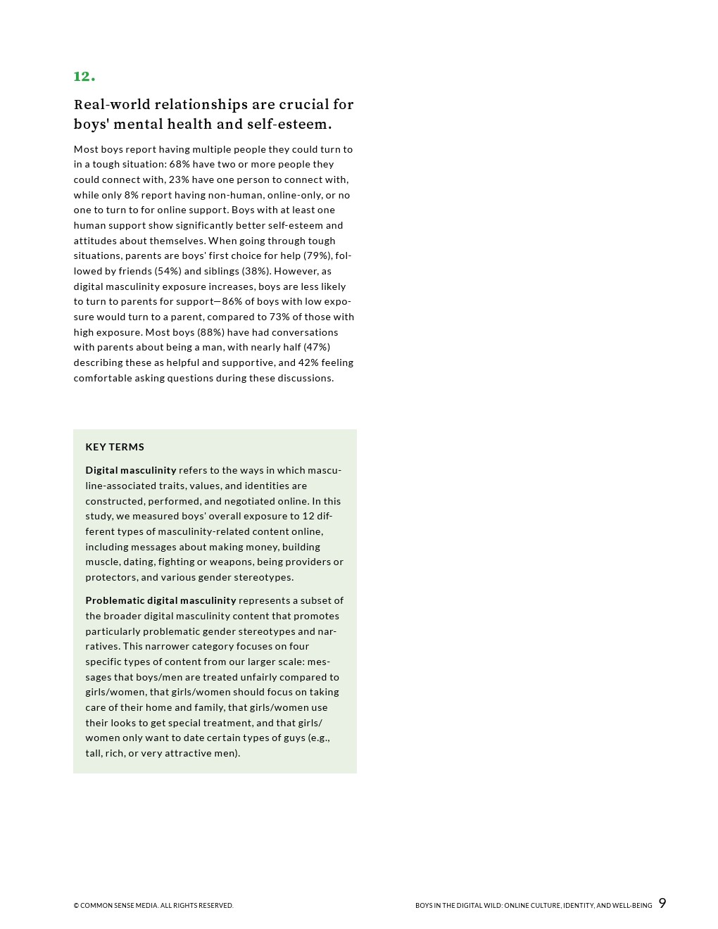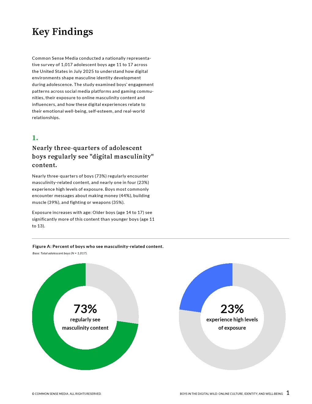 近3/4的数字时代青春期男孩经常看到”数字男性气质”内容
