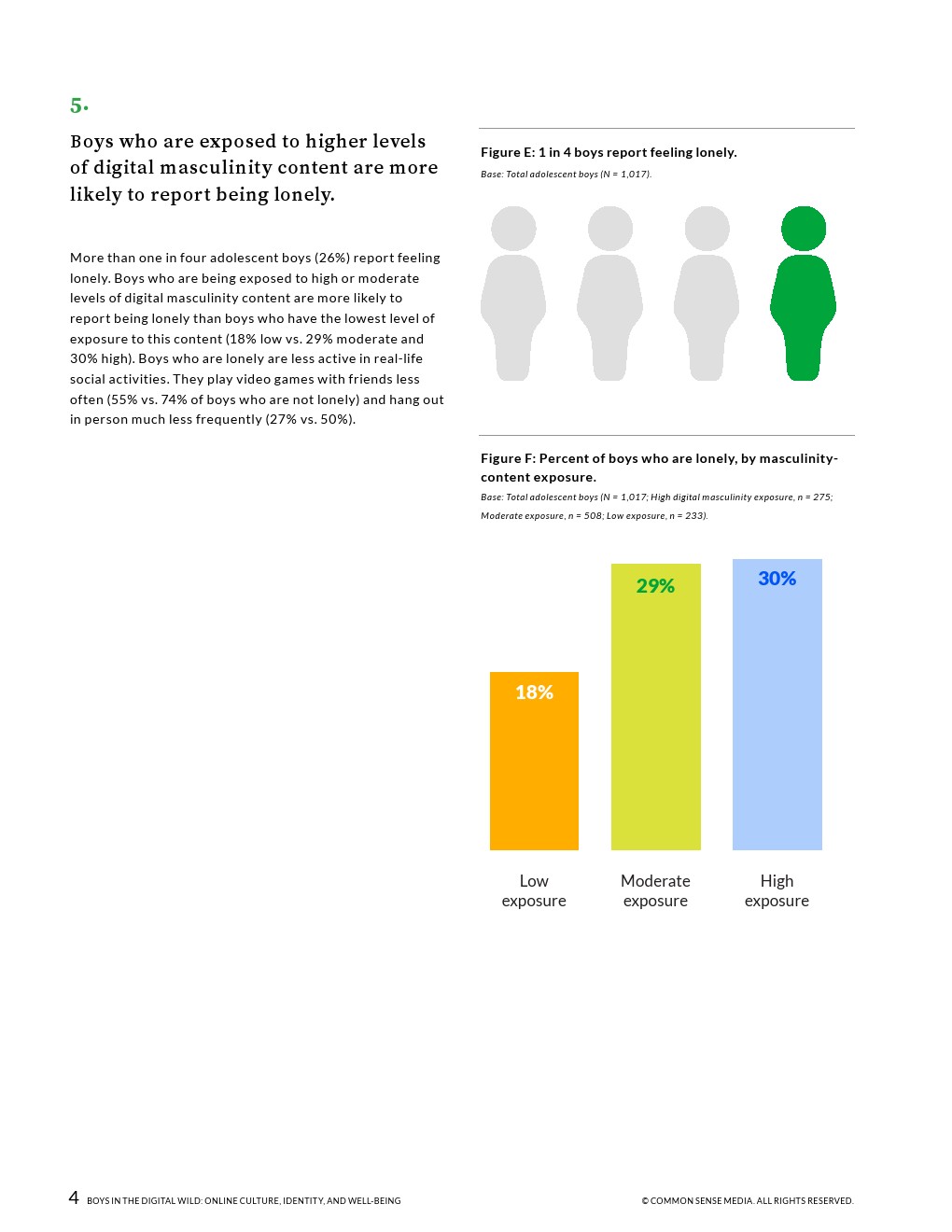 26%的青春期男孩报告感到孤独。接触高水平或中等水平数字男性气质内容的男孩,比接触水平最低的男孩更可能报告孤独感(低度接触者18% vs. 中度接触者29% 和 高度接触者30%)。