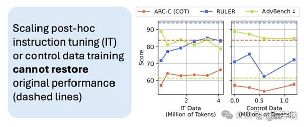 这说明,即使事后进行大量指令微调或使用高质量数据进行重新训练,也都无法完全恢复模型的初始性能。